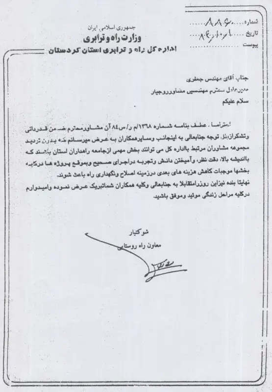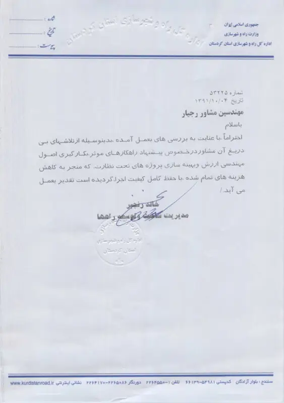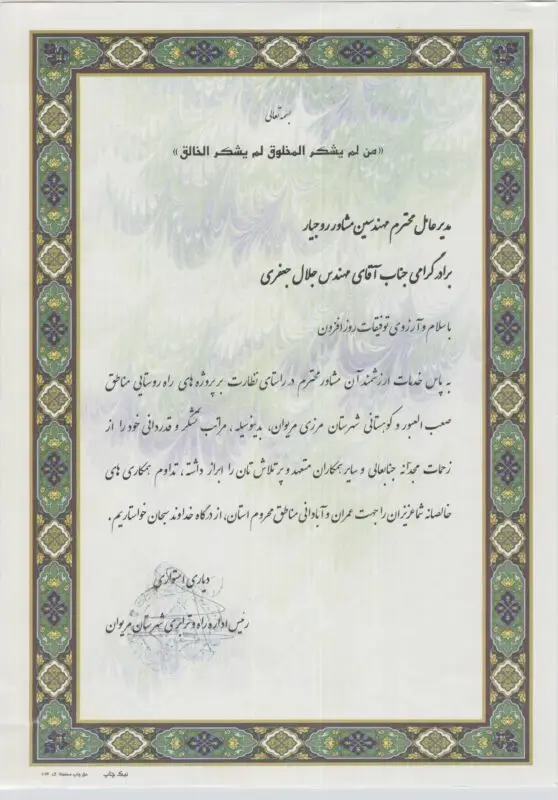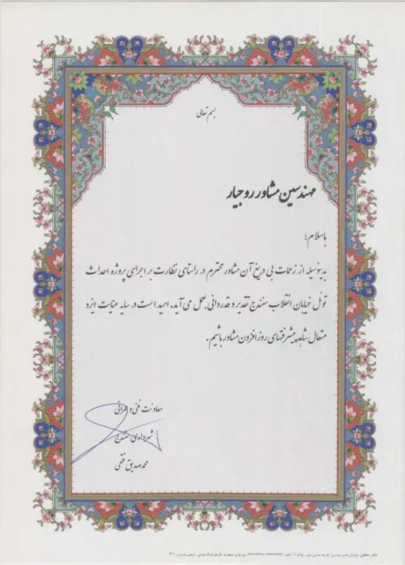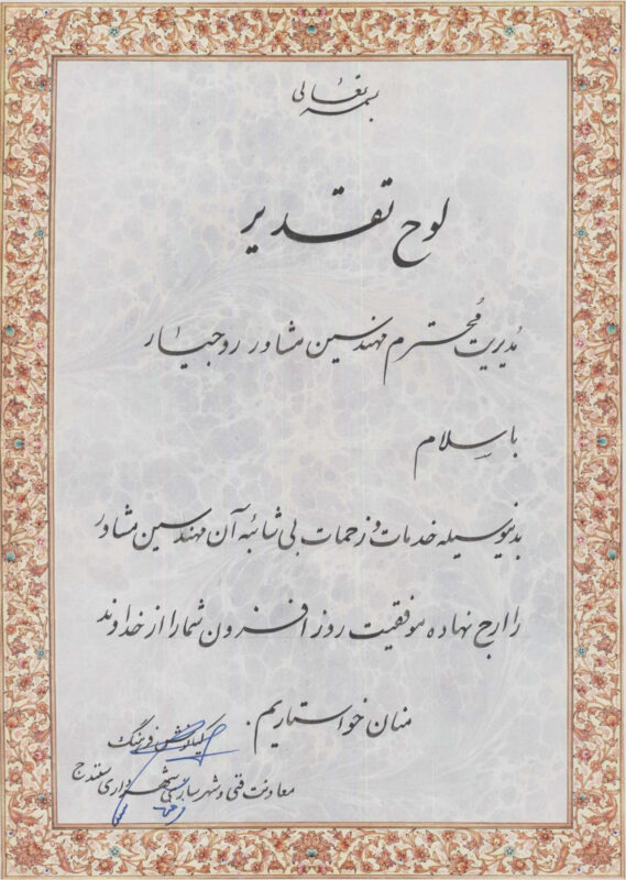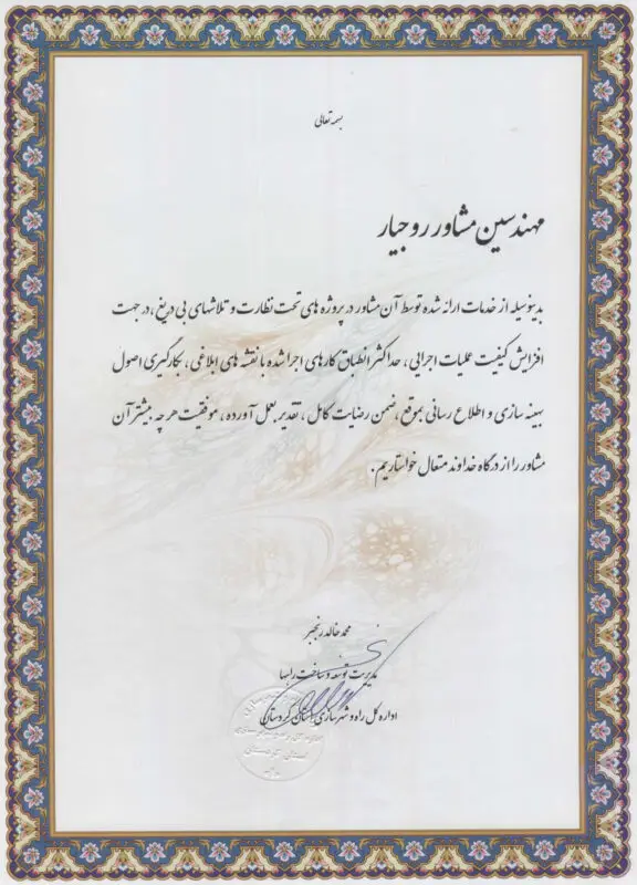 در مهندسین مشاور روجیار، ما به تلاشها و دستاوردهای خود افتخار میکنیم. تقدیرنامههایی که از کارفرماهای مختلف دریافت کردهایم، نشاندهنده تعهد ما به کیفیت، نوآوری و برتری در ارائه خدمات است. این تقدیرنامهها نه تنها رضایت مشتریان را تأیید میکند، بلکه انگیزه و اشتیاق ما را برای ادامه بهبود و پیشرفت در صنعت افزایش میدهد.